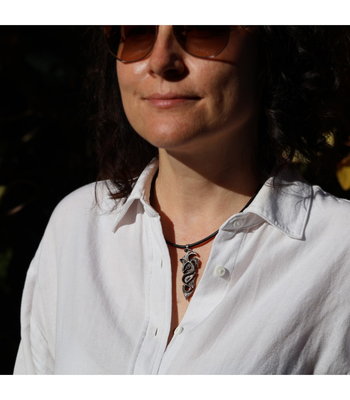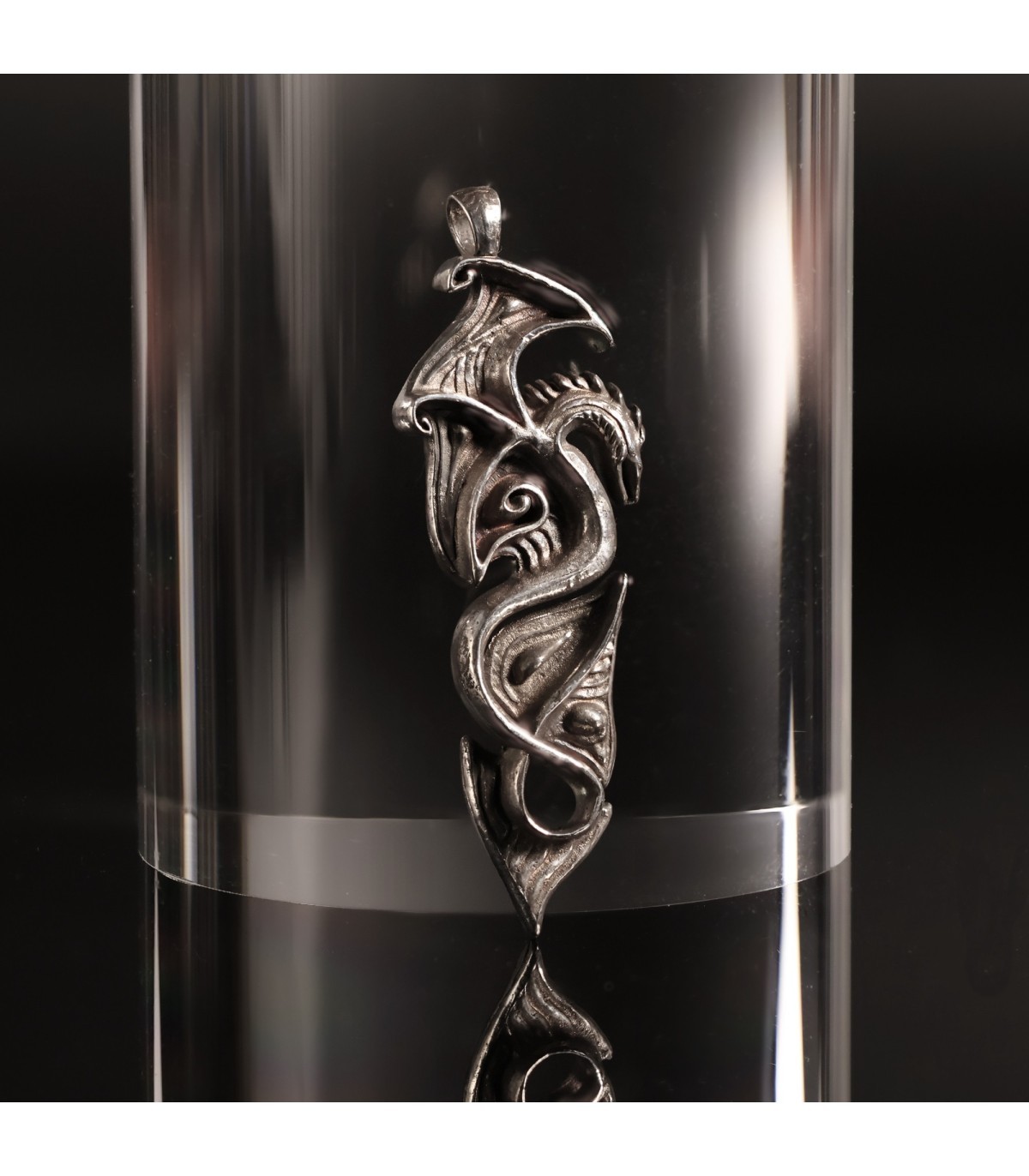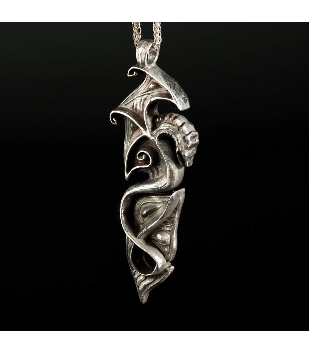 Each detail of this intricate design is meticulously sculpted, giving the pendant elegance and character. The stylized dragon, with wings reminiscent of ancient symbols, radiates a magical energy symbolizing protection and spiritual strength. This is jewelry crafted for those who value strength, freedom, and wish to possess an amulet that highlights their unique style and individuality.