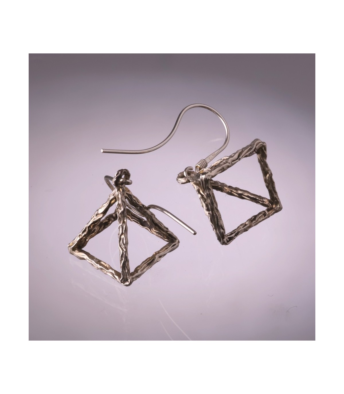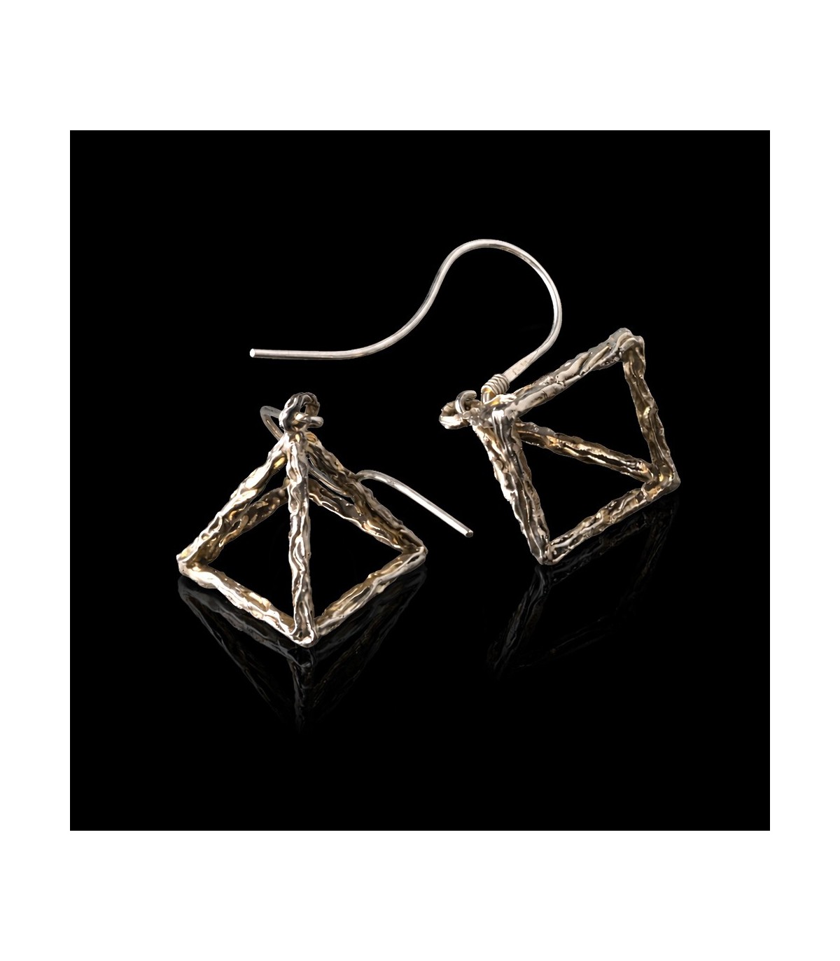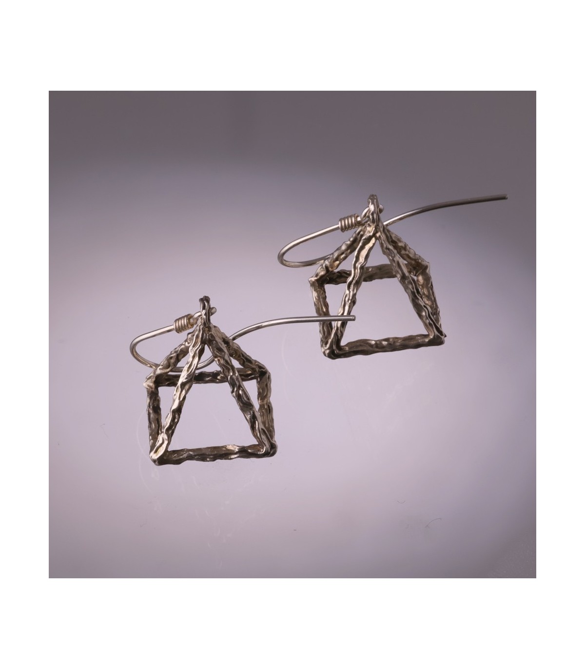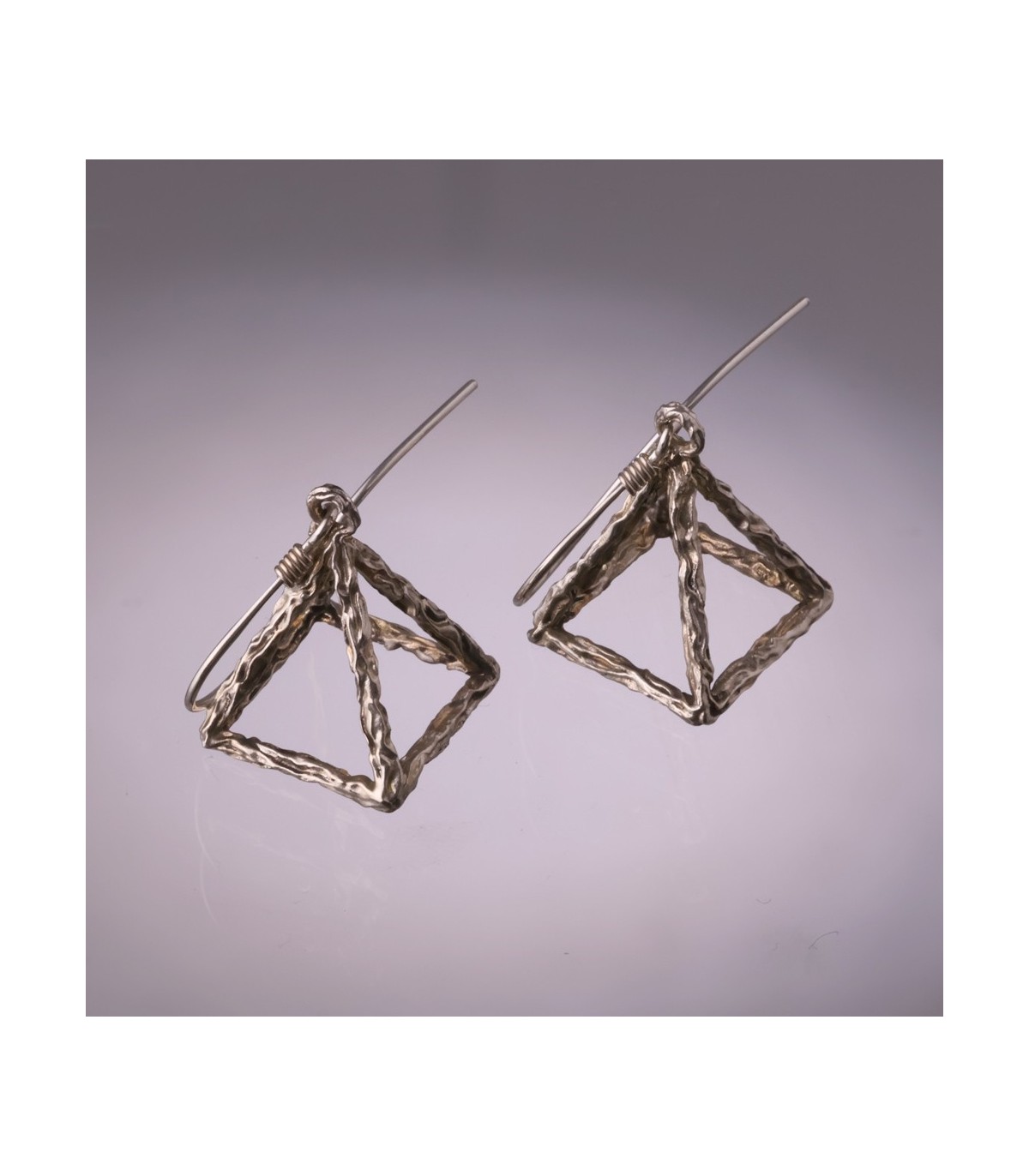 Each pyramid is built from individually formed silver elements, subtly irregular on the surface, emphasizing the artisanal nature of the piece. The open structure allows light and air to pass through the form, creating a sense of lightness despite the strong, grounded geometry. As the earrings move, reflections shift across the silver, giving the pyramids a living, dynamic character.