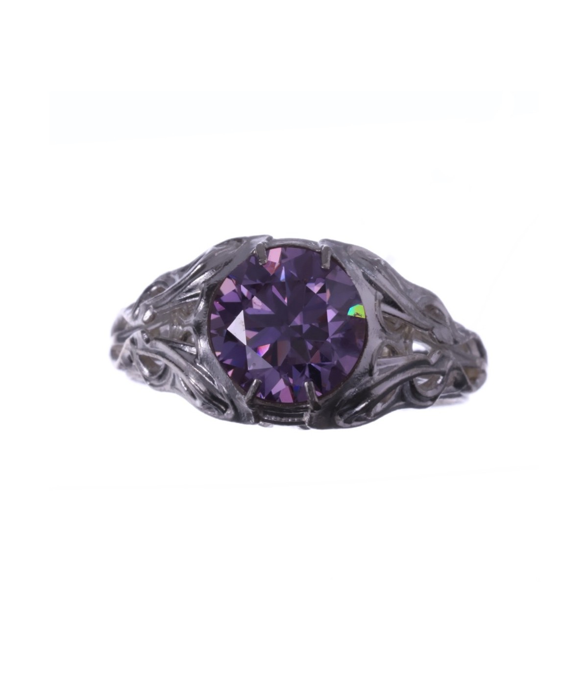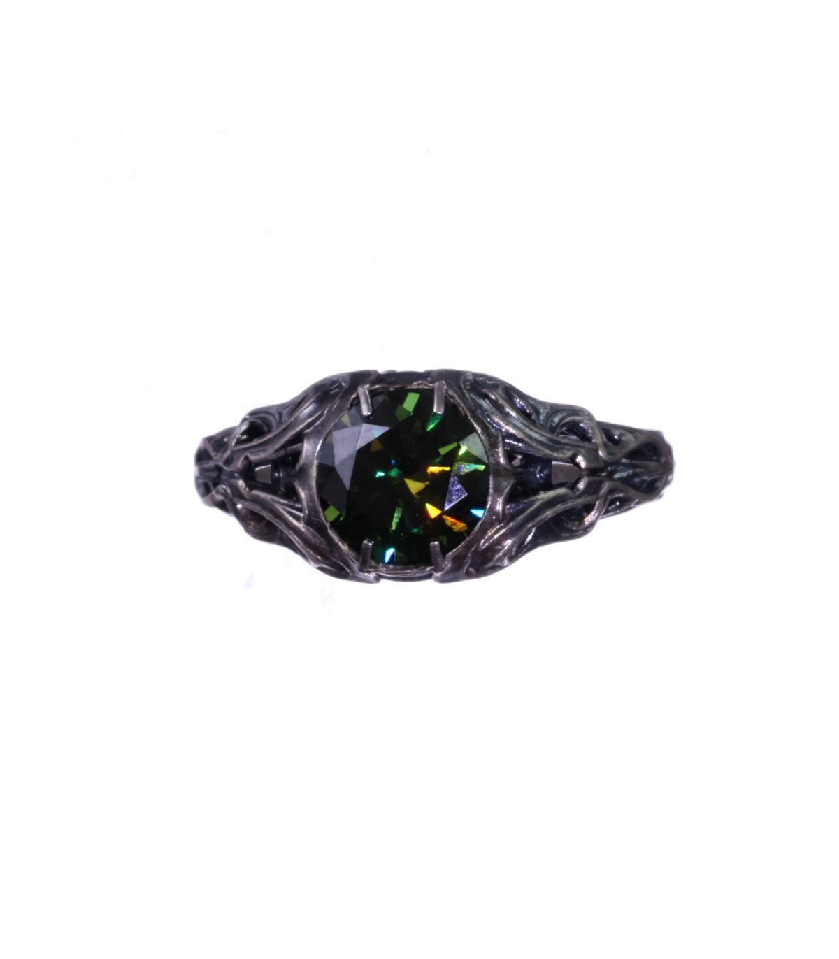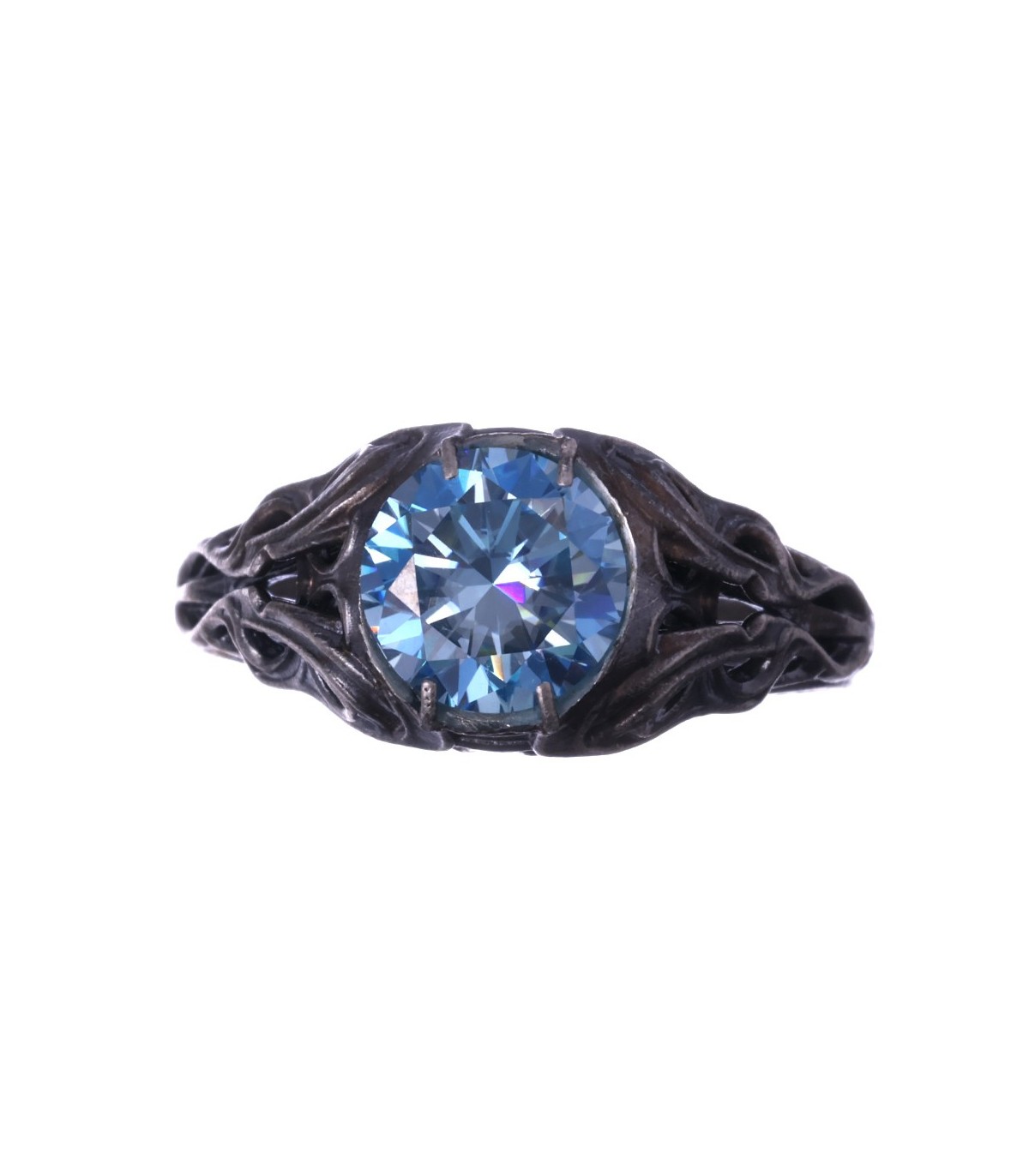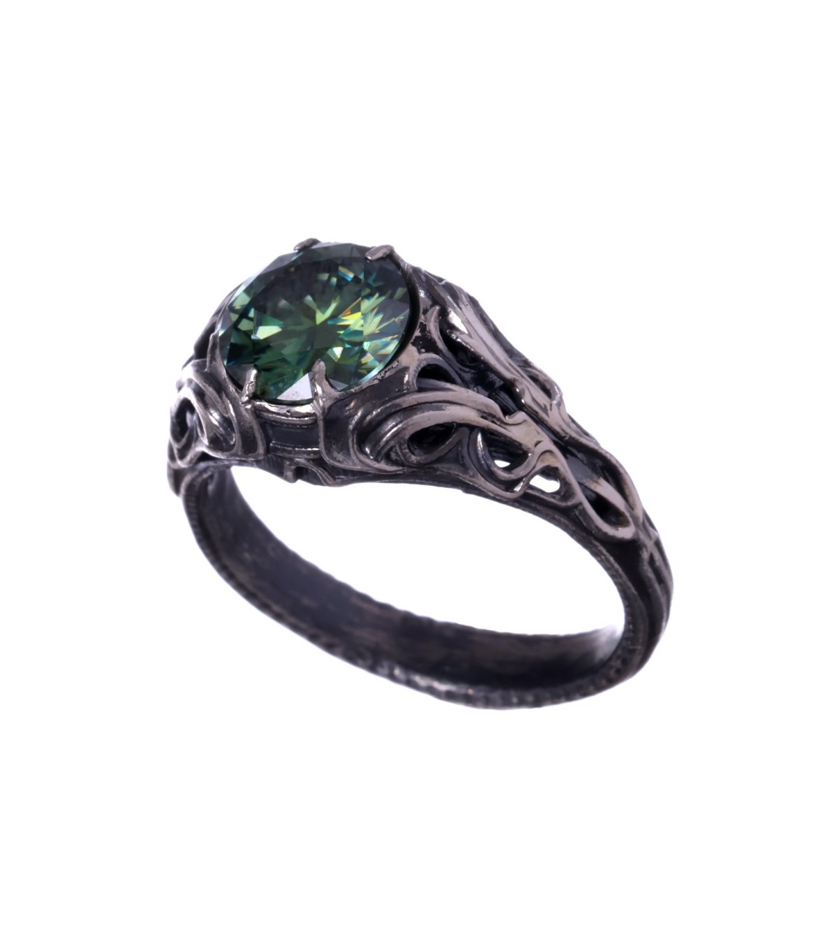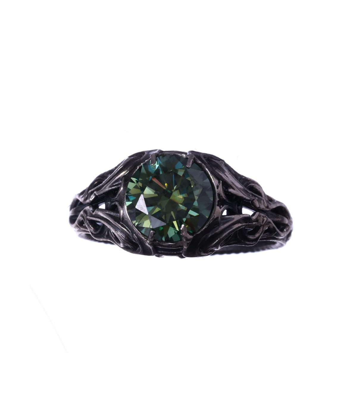 The setting is richly sculpted, with openwork, flowing forms that move organically around the band. These living lines give the ring both depth and lightness, allowing illumination to pass freely through the structure. From every angle, the moissanite responds with intense fire and sharp clarity, becoming the undeniable heart of the piece — radiant, focused, and alive.
