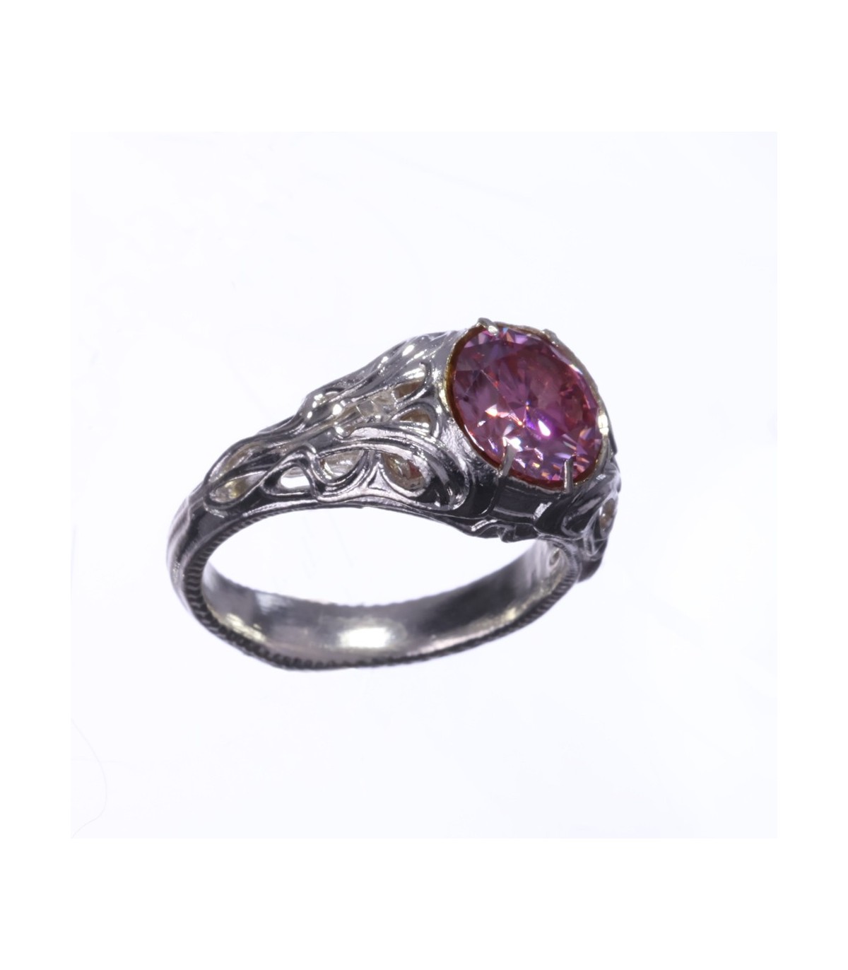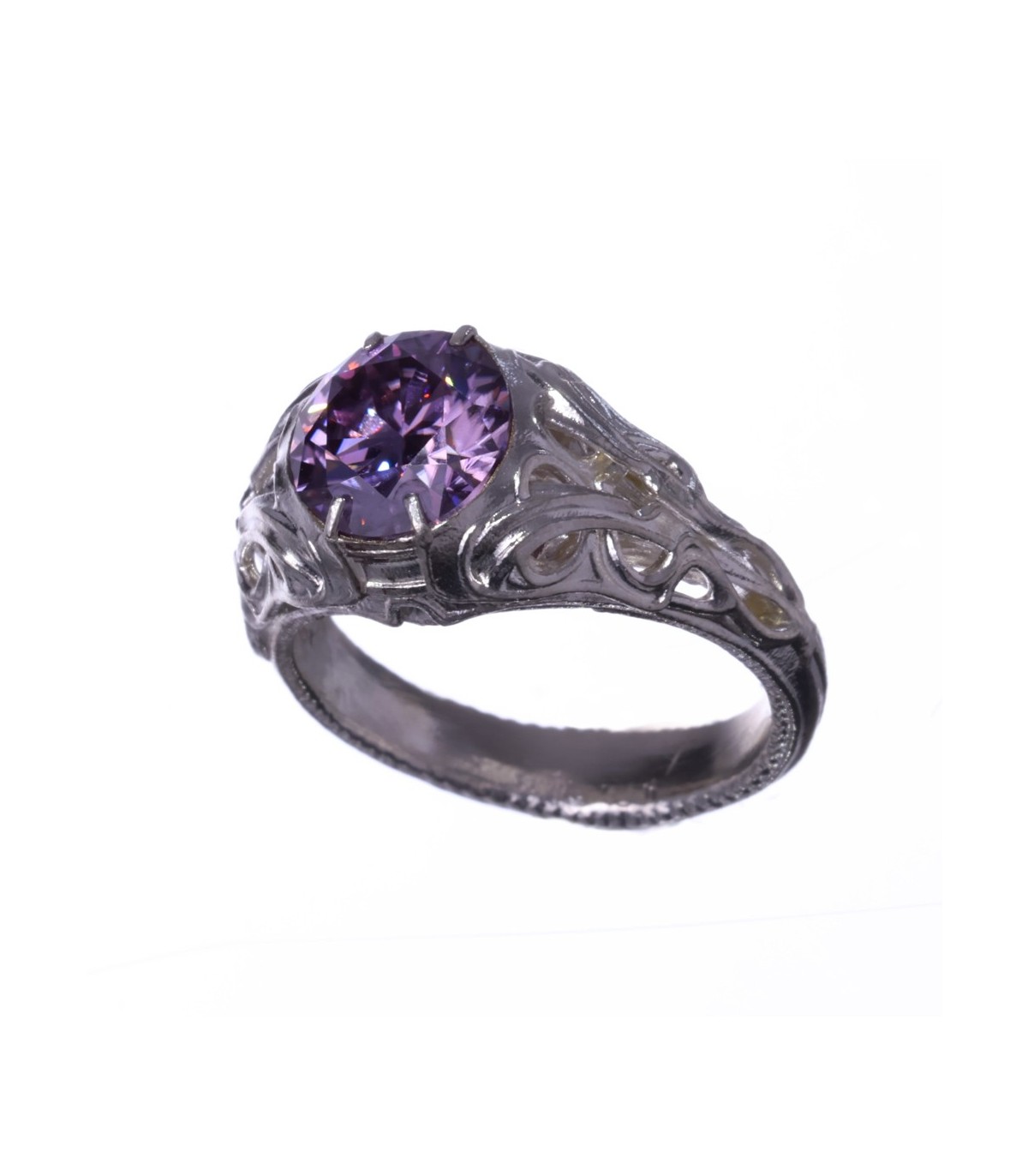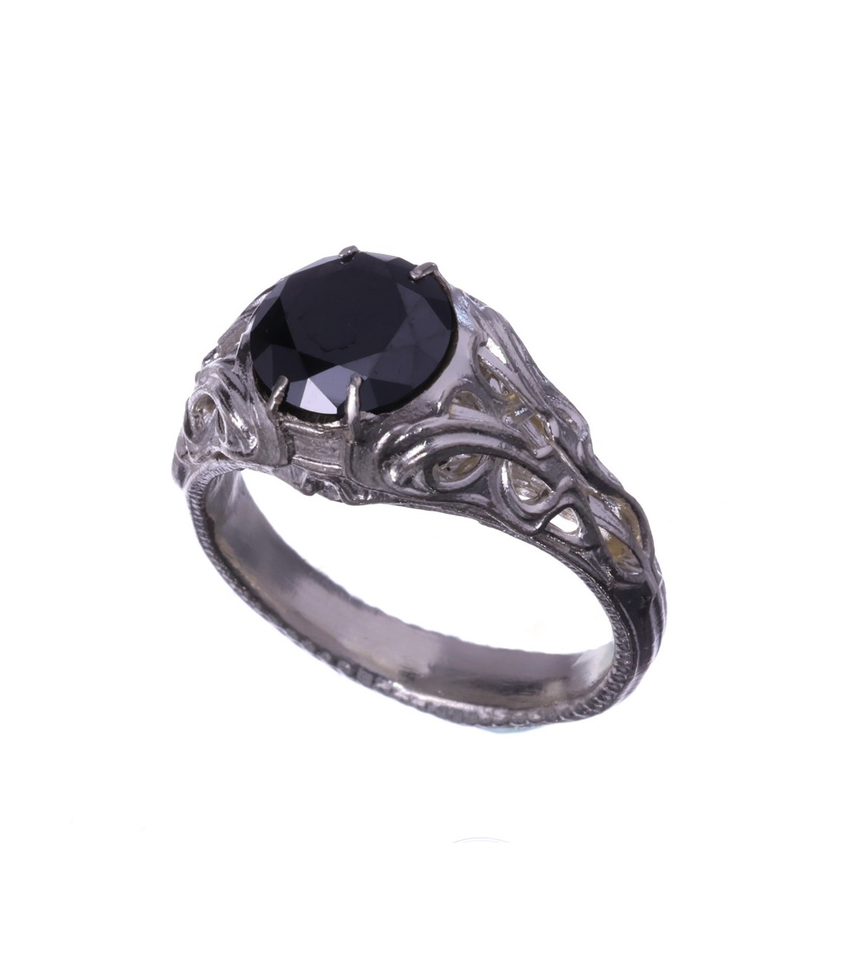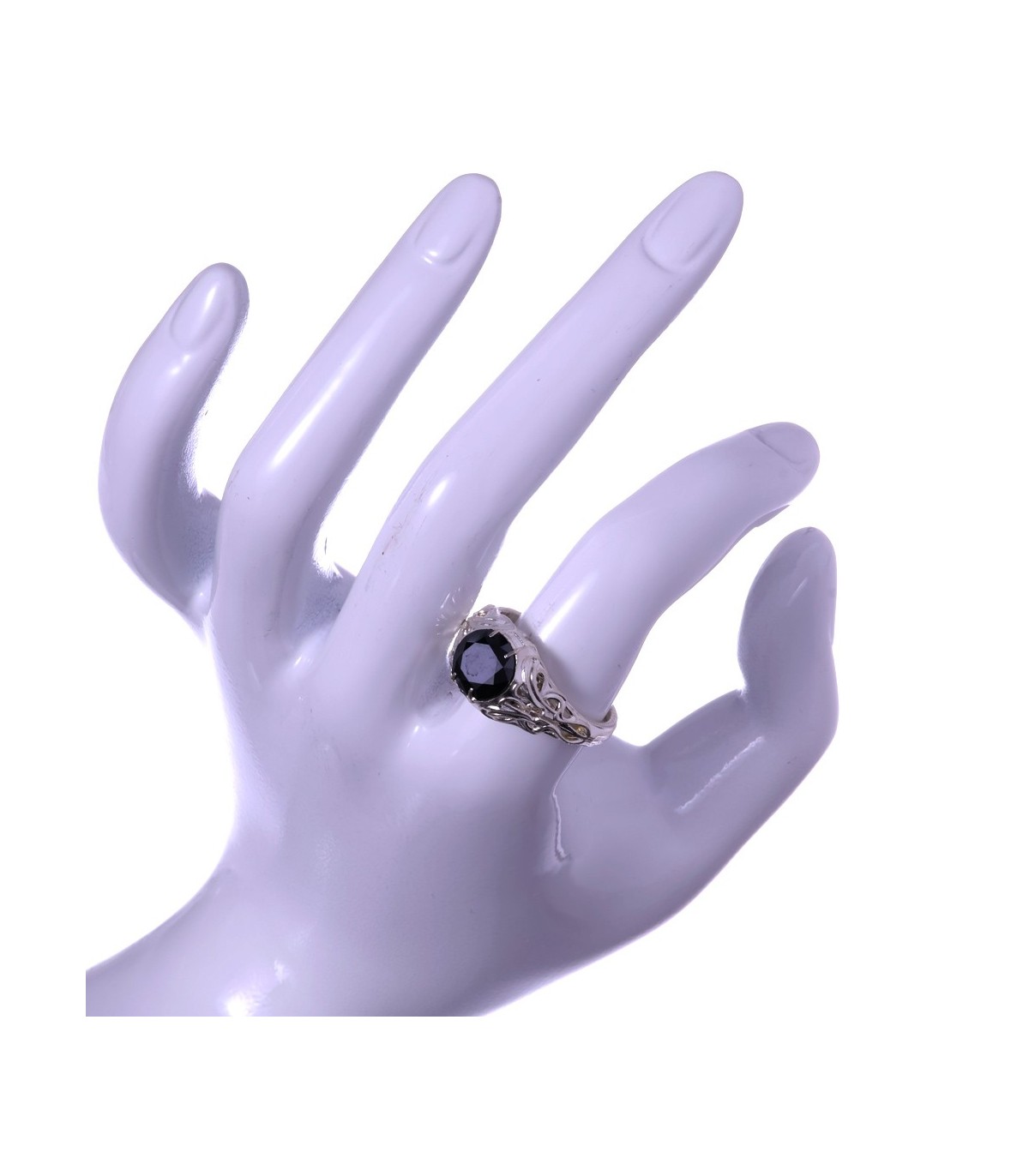 The setting is richly sculpted, with openwork, flowing forms that move organically around the band. These living lines give the ring both depth and lightness, allowing illumination to pass freely through the structure. From every angle, the moissanite responds with intense fire and sharp clarity, becoming the undeniable heart of the piece — radiant, focused, and alive.