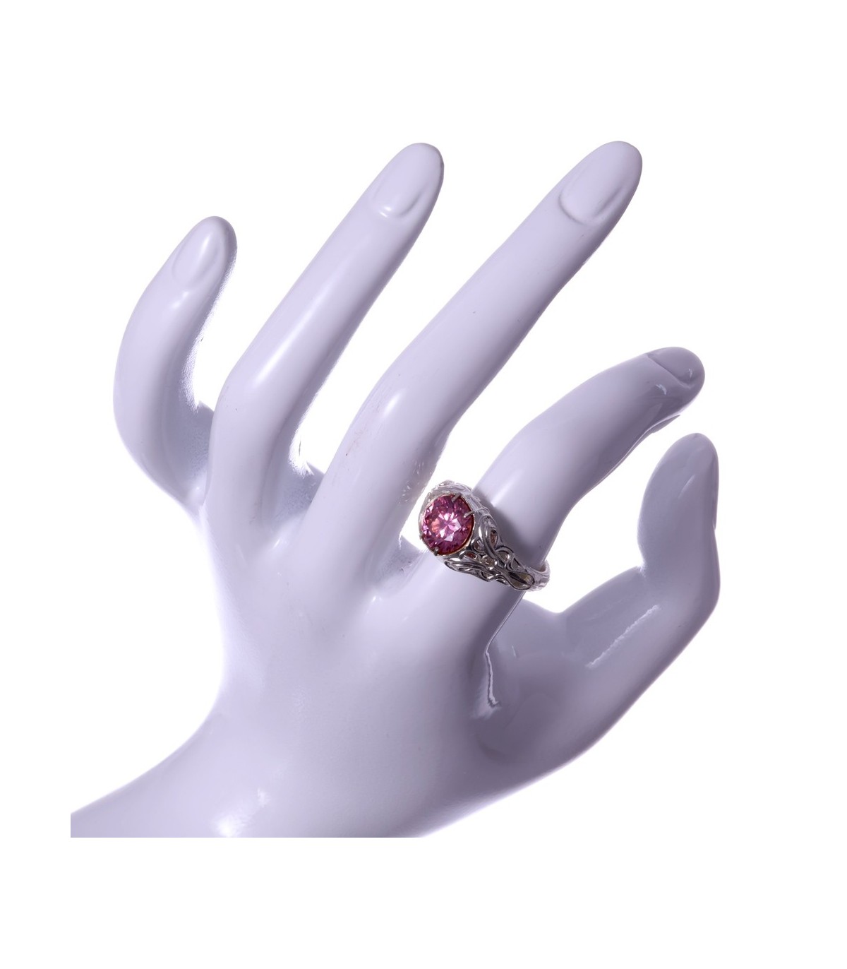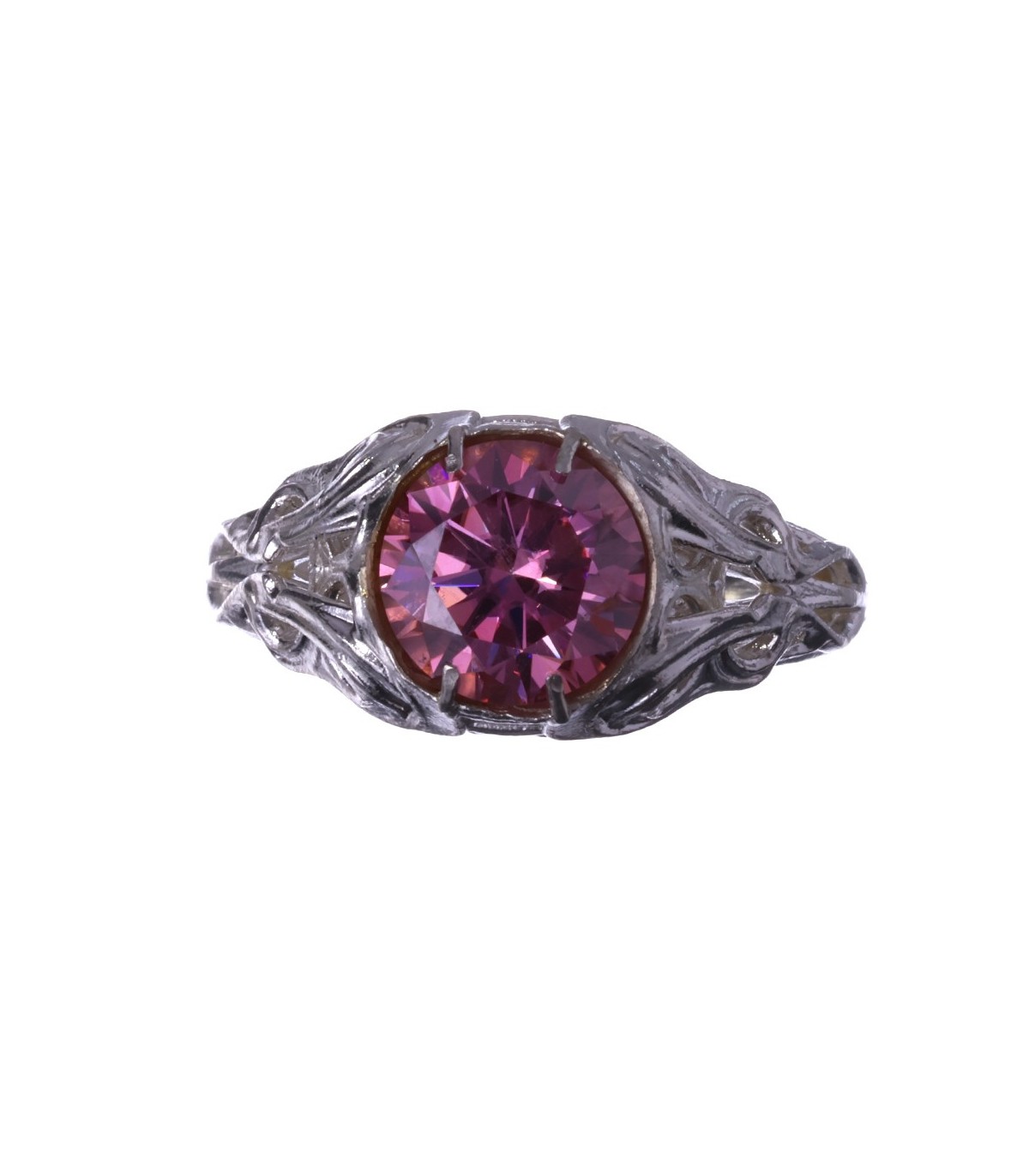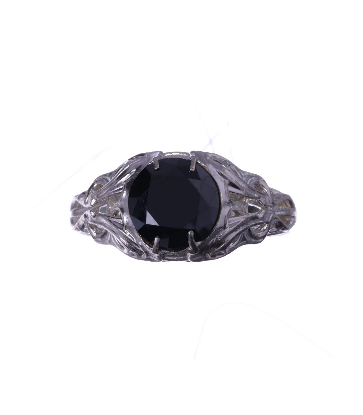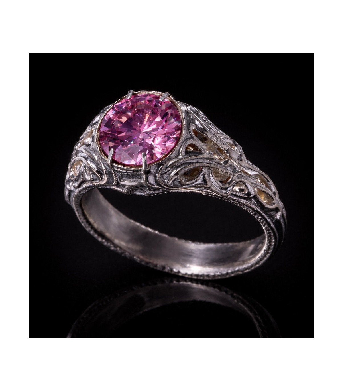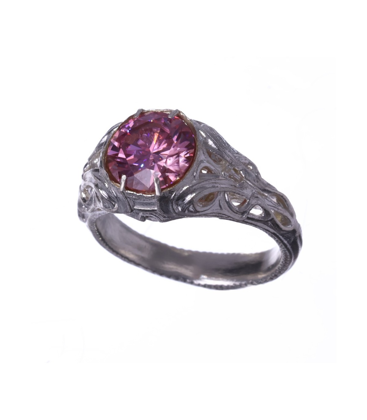 The setting is richly sculpted, with openwork, flowing forms that move organically around the band. These living lines give the ring both depth and lightness, allowing illumination to pass freely through the structure. From every angle, the moissanite responds with intense fire and sharp clarity, becoming the undeniable heart of the piece — radiant, focused, and alive.